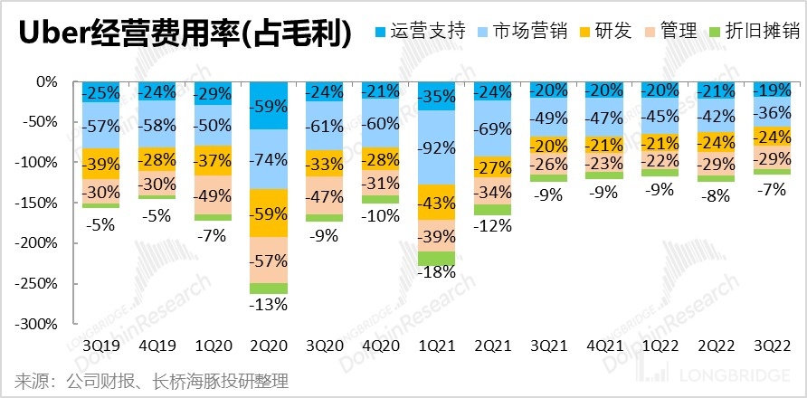 同樣由於營收口徑變動的問題,在評估經營費用時,我們直接將其和毛利潤比較。從下表可見,Uber 和其他科技公司一樣,除了相對剛性的研發和管理費用支出仍在環比增加。在公司營收和毛利仍有雙位數增長時,Uber 在營銷和運營支持上的支出都已環比減少。