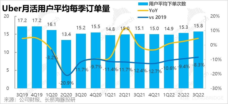價量驅動因素來上,通脹和外賣增量業務帶來的價格紅利已基本結束,Uber 正逐漸重回由量驅動的常態增長。具體來看,本季打車 + 外賣的訂單總量為 19.5 億次,無論從同比、還是相對 2019 年來看,訂單量增速自 1Q22(打車業務爆發式復甦)以來都進入了持平的平台期,可見公司訂單量的增長已基本拜託了疫情影響,進入了常態的穩定增長期。