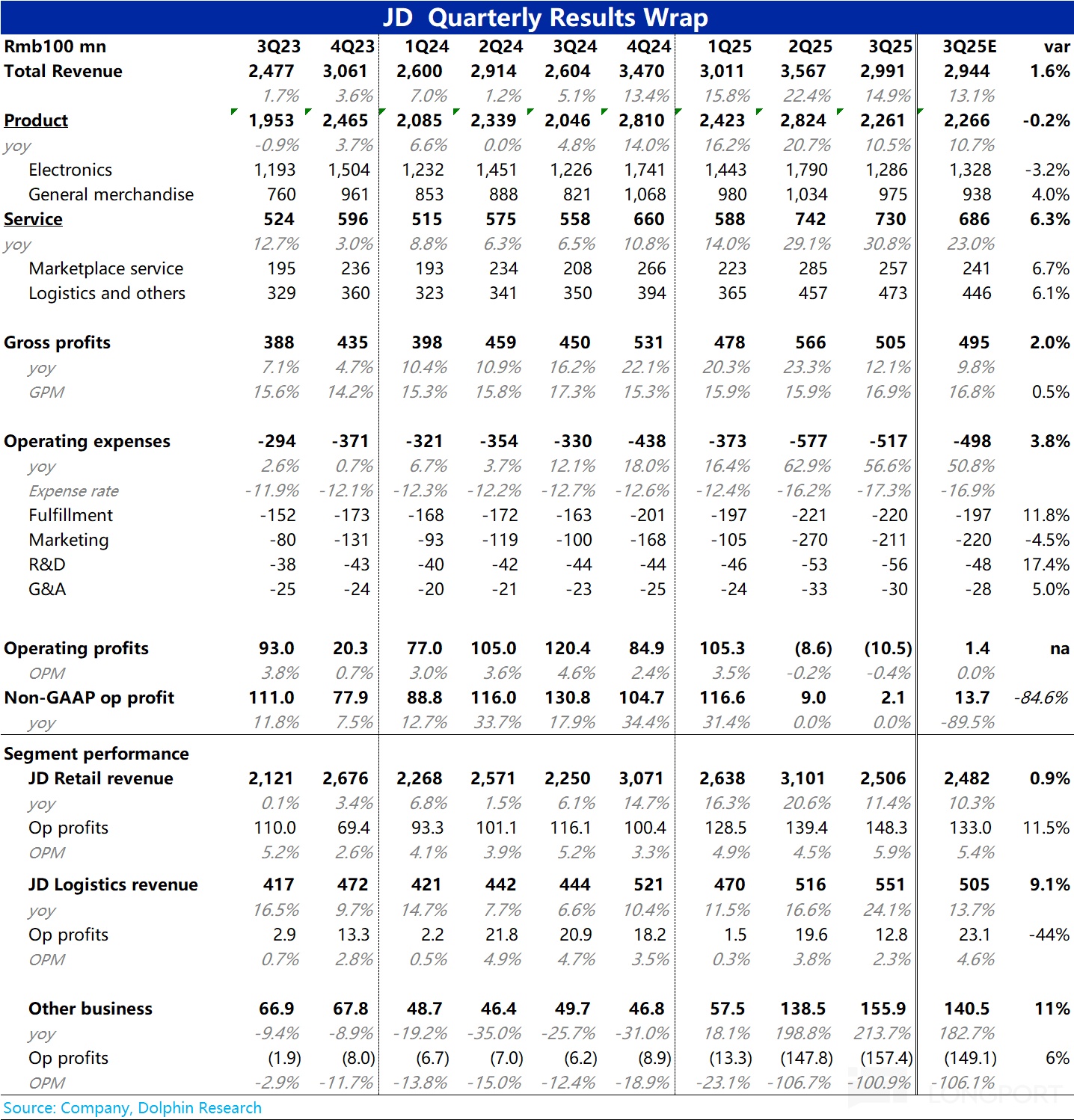 零售收入同比增長 11%,增長源於日用百貨、市場平台及營銷服務收入加速增長;利潤方面,京東零售的毛利率與營業利潤率均保持穩健擴張,彰顯業務規模效益與運營效率提升。