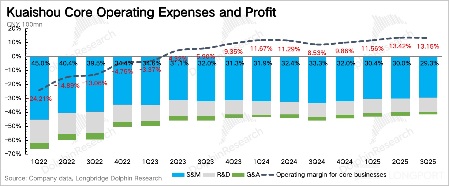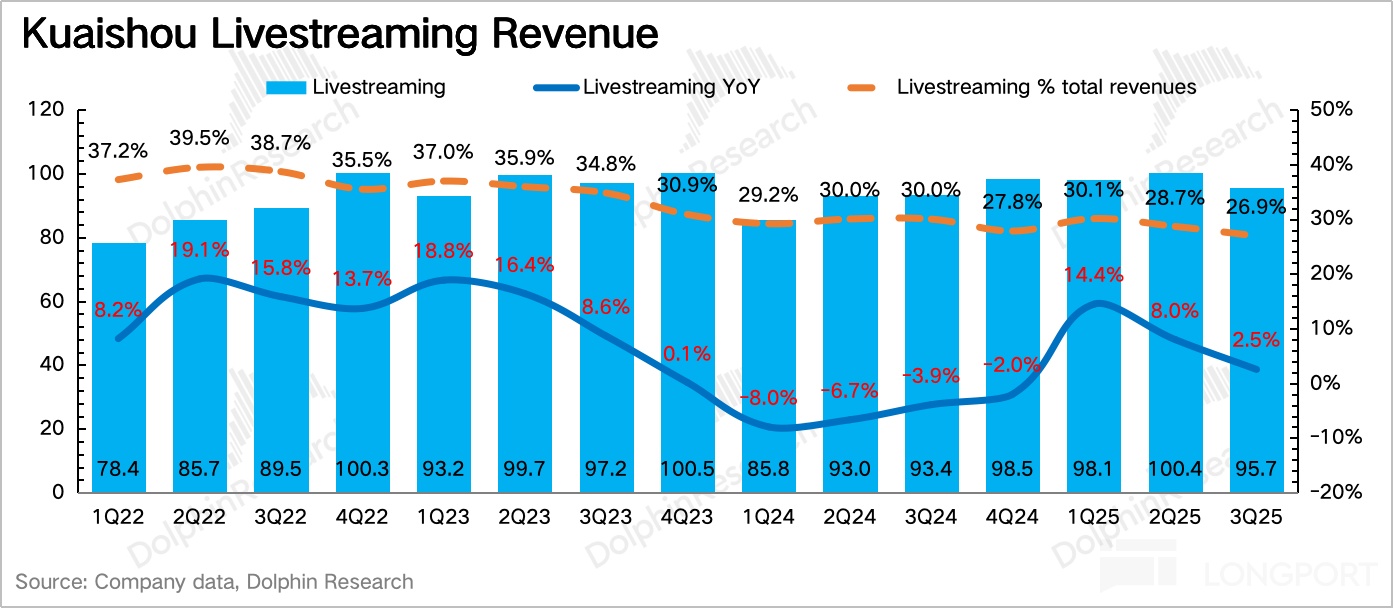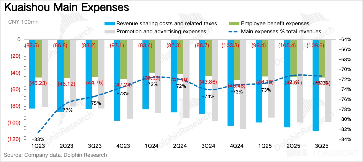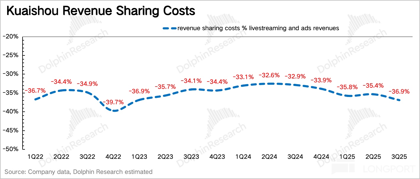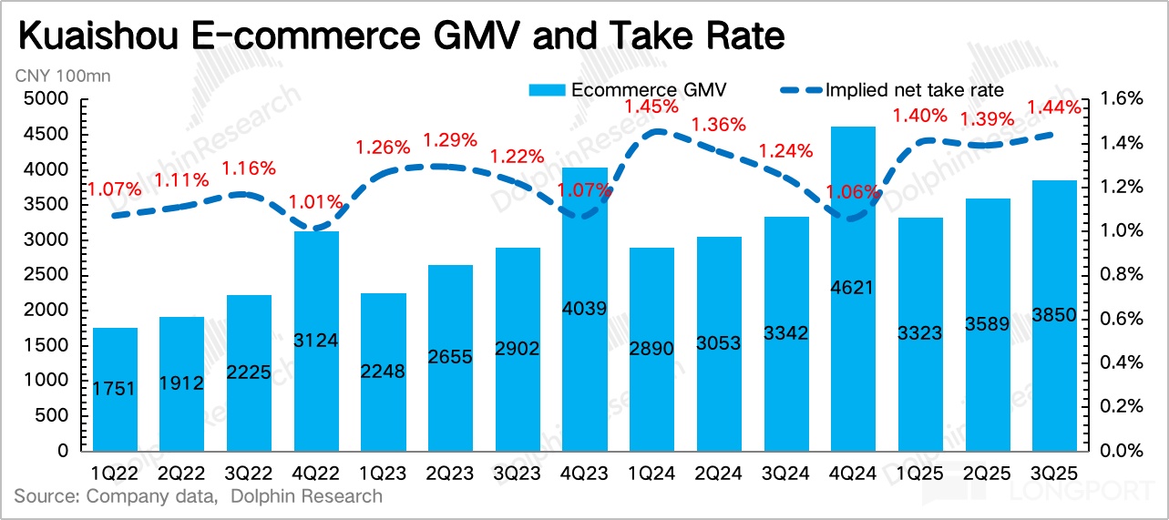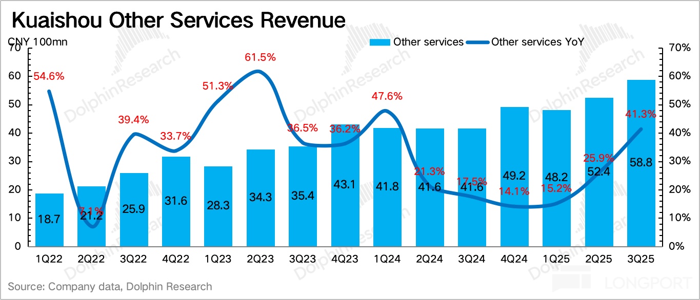 3. 電商增長放緩:三季度 GMV 增速 15%,相比上季度有所放緩。基數變化固然有影響,但環比看季節間波動,三季度的增速也小幅不及往期,這其中或許與部分達人停播有關。但如果剔除可靈(按 3.1 億算)再看其他收入,那麼本季度同比增速高達 34%,不僅明顯加速,也顯著高於 GMV 增速。
