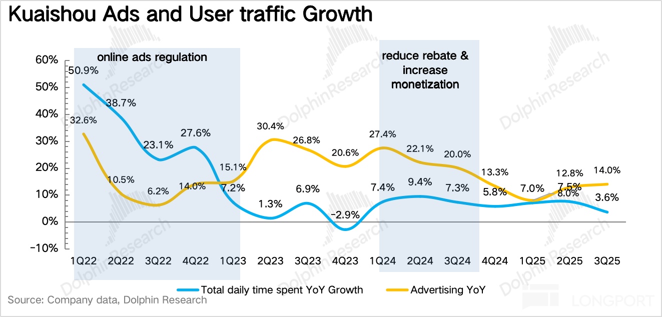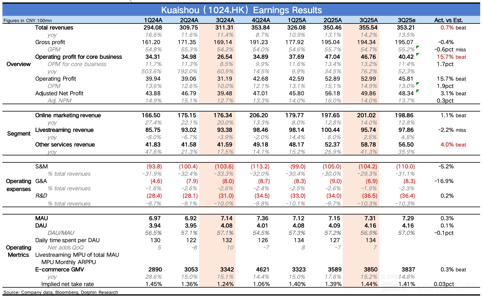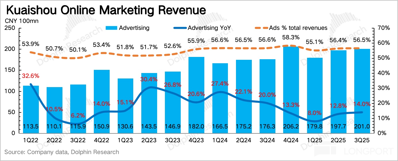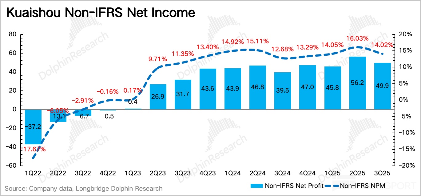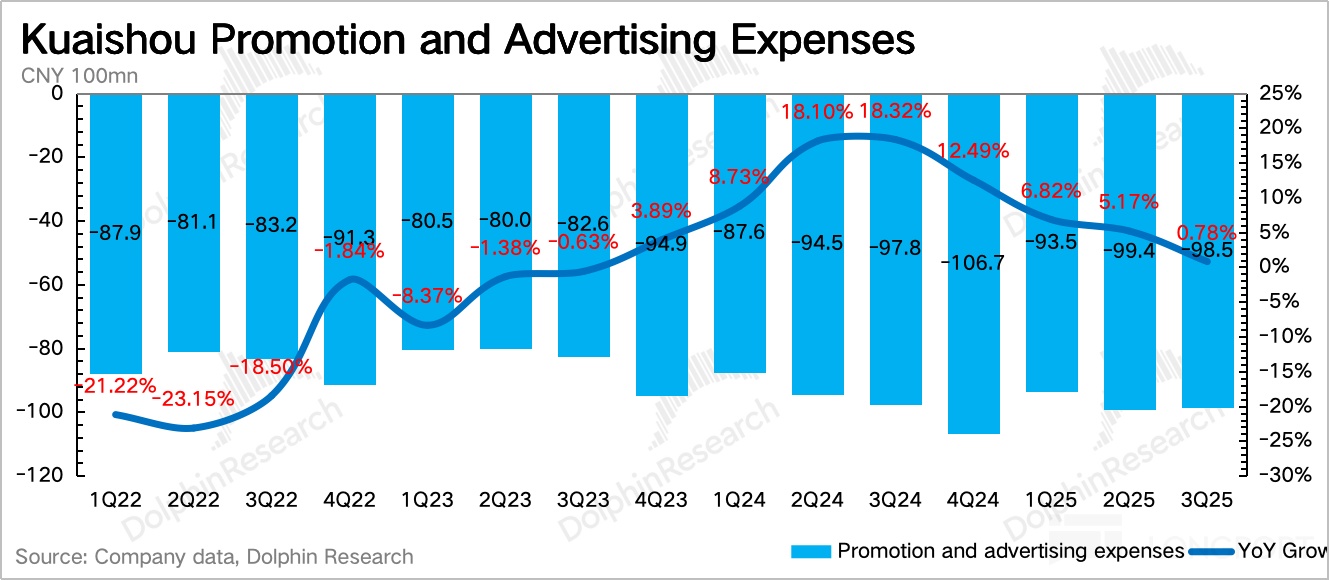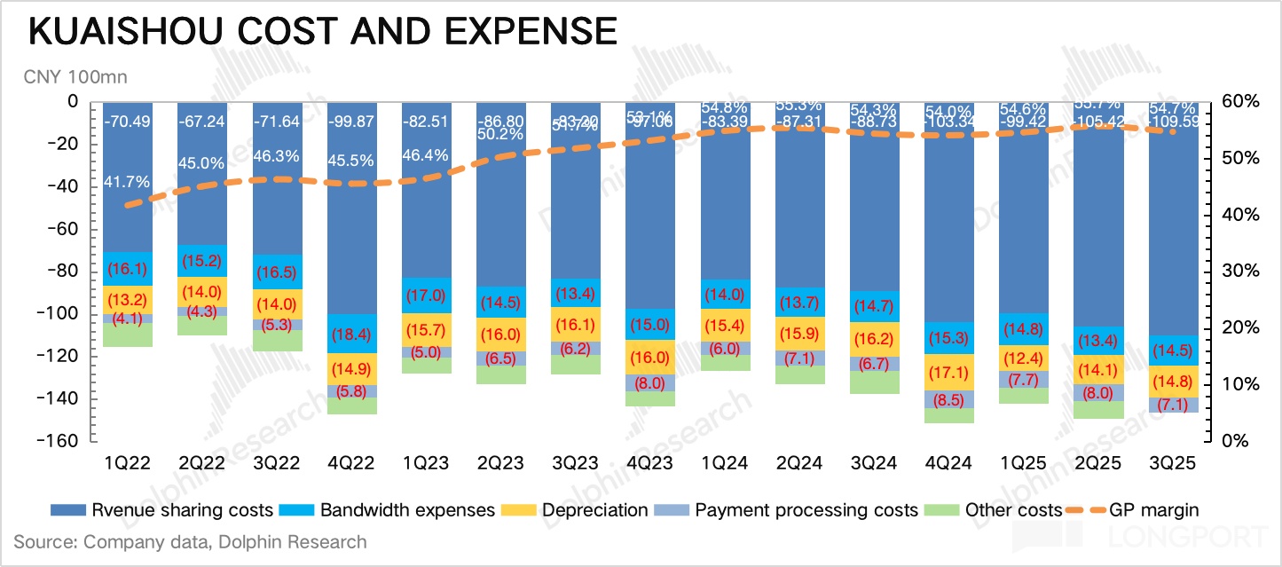 3. 電商增長放緩:三季度 GMV 增速 15%,相比上季度有所放緩。基數變化固然有影響,但環比看季節間波動,三季度的增速也小幅不及往期,這其中或許與部分達人停播有關。但如果剔除可靈(按 3.1 億算)再看其他收入,那麼本季度同比增速高達 34%,不僅明顯加速,也顯著高於 GMV 增速。