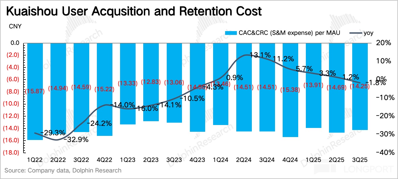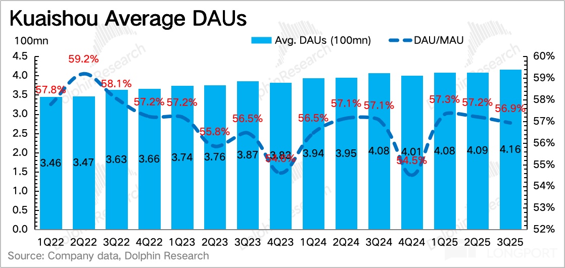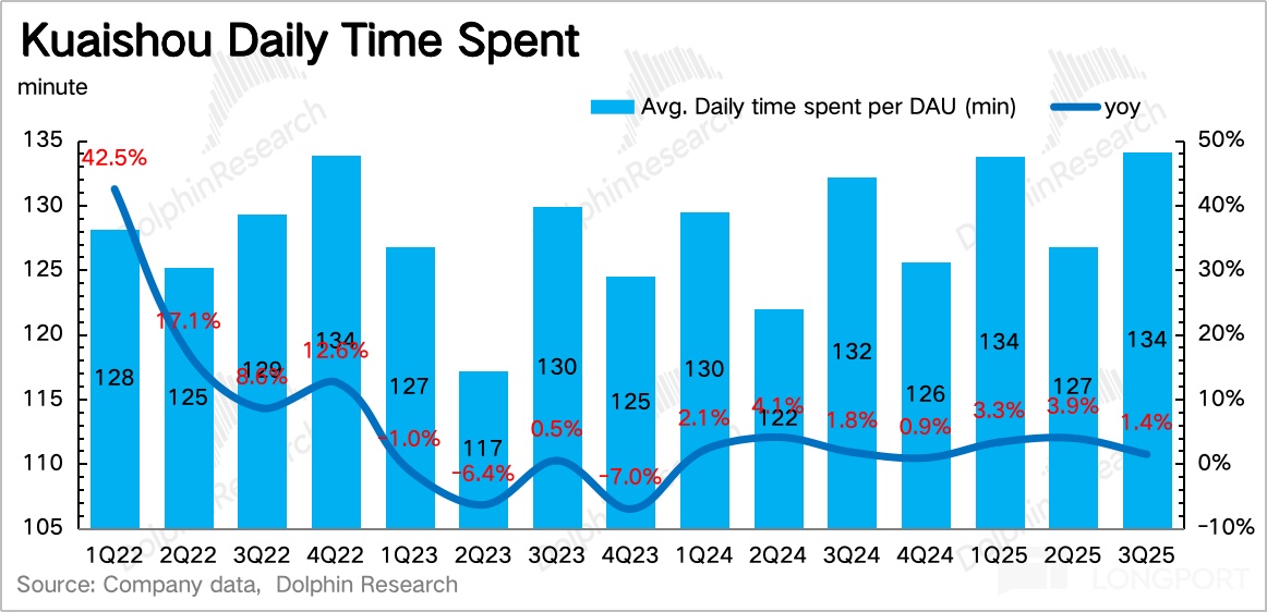 快手的用户指標近兩年來在第三方平台表現一直不太好,雖然數據不夠全面,但至少橫向對比看,壓力比同行更大。Q3 實際財報披露的用户指標,也是保持平穩,但日均用户時長創新高,可能與短劇、獨家晚會等豐富內容帶來的增長。
