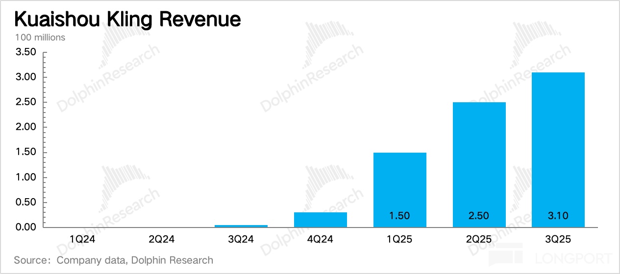 從預期來看,今年可靈的收入超 10 億元人民幣,也就是 1.5 億美金是大概率。按此趨勢,在 Kling 2.5 Turbo 的助攻下,Q4 則有望摸一摸 4 億 RMB 收入,那麼此時年化規模已達到 16 億,在視頻大模型發展初期,我們認為暫時不用太過擔心明年已經會有競爭侵蝕存量盤的影響,這樣來算明年收入至少比今年增長 60%。按 SaaS 平台成長期的估值區間 10-20x PS,可靈的價值短期看也能值一個 150-300 億元的水平,相比於快手目前 2500 億市值,帶來 6-12% 的增量空間。