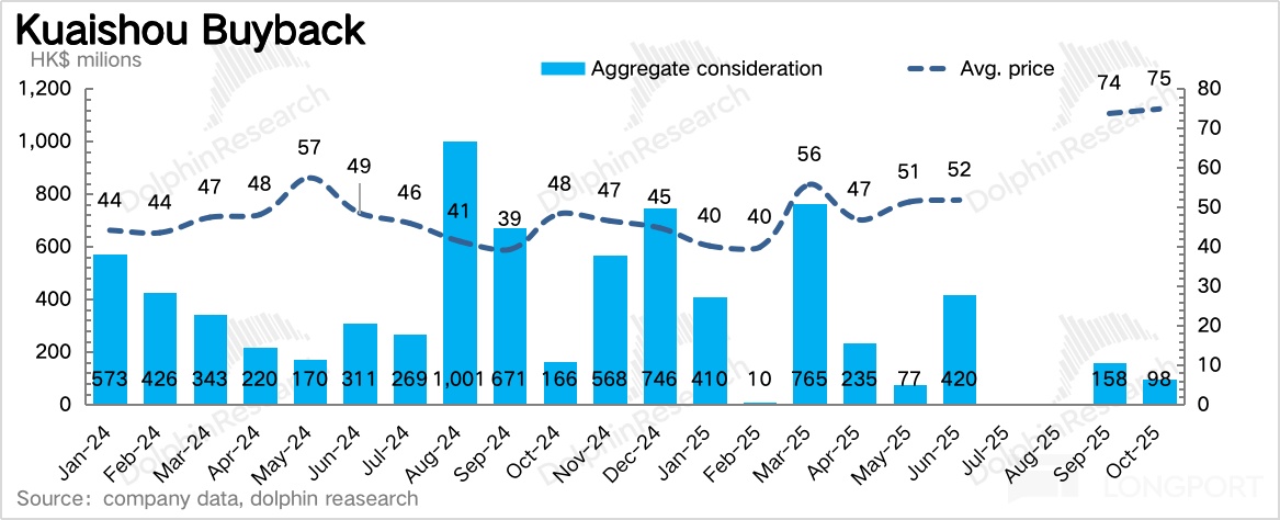 7. 回購明顯放緩:可能因為股價回升飛速,三季度公司減少了回購動作,三個月只回購了 213 萬股,耗資 1.58 億 HKD,均價 74 港元/股。加上 10 月的回購量,今年截至當前,一共回購了 22 億港元 +20 億股息,四季度按照正常 5 億 HKD 回購節奏,合計的股東回報收益率為不足 2%,這個水平並不高。目前快手賬上淨現金 174 億(現金 + 短期投資 - 短期借款),理論上仍有提高股東回報的空間。