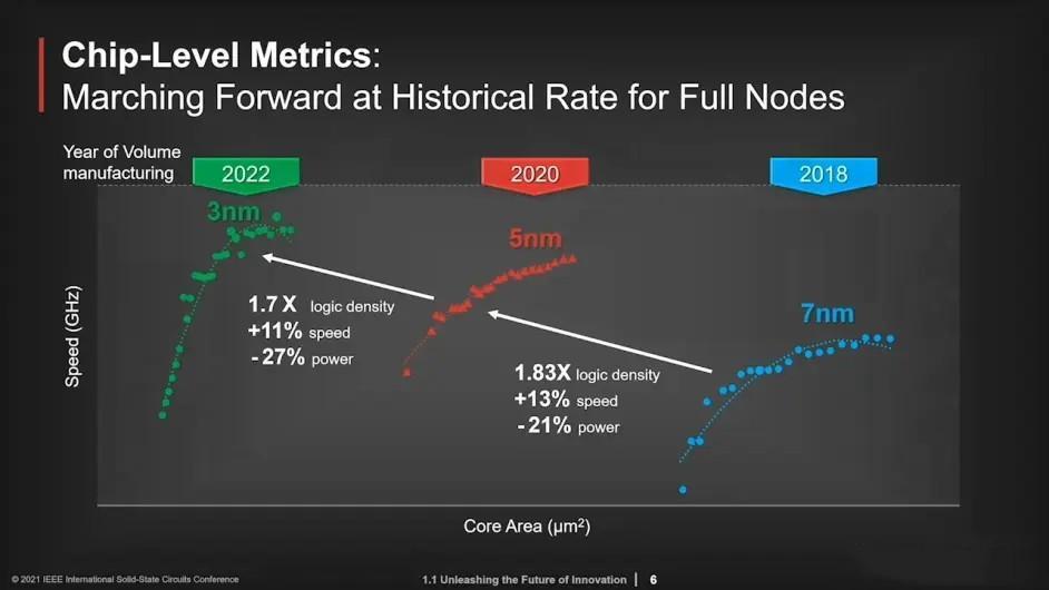 當數字電路在軟件設計上趨近瓶頸時,決定 CPU 或 SoC 性能的關鍵要素,也就轉移到芯片的製程工藝上來了,目前最先進的高端芯片製程工藝有 7nm、5nm、4nm 以及明年由 iPhone 15 系列首發搭載的 3nm A17 等。