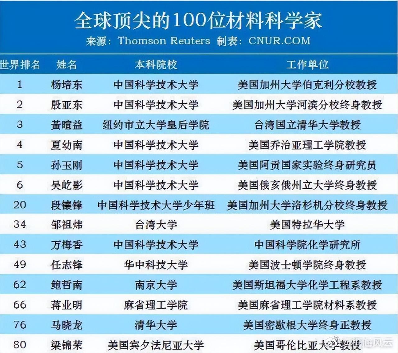 再有關乎芯片性能的材料,在材料科學領域,我國更是人才濟濟,全球頂尖的 100 位材料科學家中,14 名都是華人,前 6 名中,更是 5 名都來自於中國科技大學的中國人。