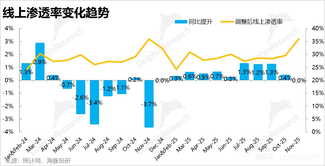 此外,從線上實物零售/剔除汽車外社零總額計算出的線上滲透率,也能看到 10 月同比擴張了 0.4%,而 11 月則同比持平。同樣 10 月比 11 月稍強,但也可見11 月線上增長較弱是受整體商品零售都弱的影響,而非線上滲透率的負增長。
