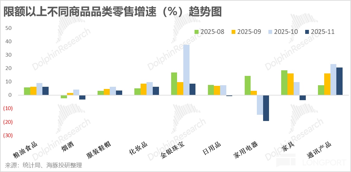 分商品品類來看,哪些品類的拖累最明顯?首先根據統計局披露,佔比最大的單項--汽車零售額 10 月和 11 月分別同比下滑了 6.6% 和 8.3%,而剔除汽車的社零總額本月是增長 2.5% 的。因此,汽車零售的走弱是 10~11 兩月社零走弱的重要影響之一。