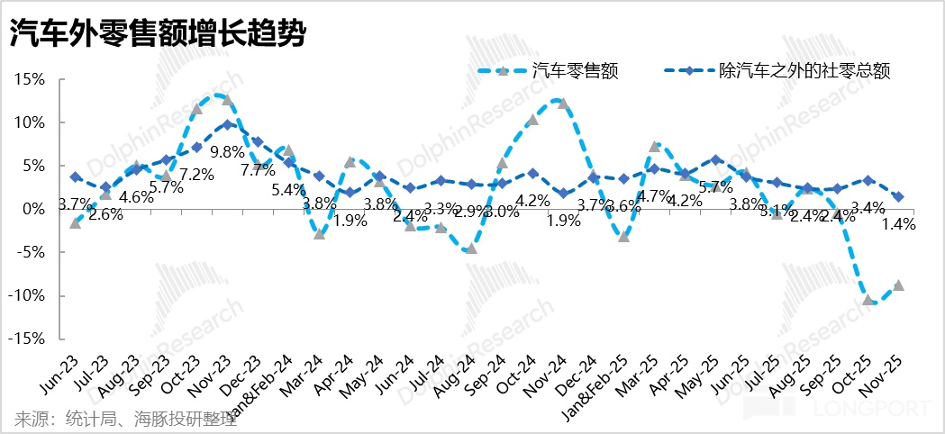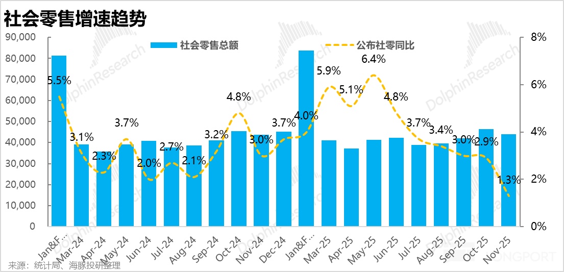 根據統計局披露,11 月國內社零總額同比增長了 1.3%,較前幾個月約 3% 的水平再度大跳水。從數據上看相當疲軟,也不幸坐實了海豚君之前的擔憂,創出了疫情後以來(23 年開始)社零增速的最低點。即便按 10、11 兩月的簡單平均增速 2.1%,也上次低谷的水平相當了(24 年 9 月大反轉之前)。