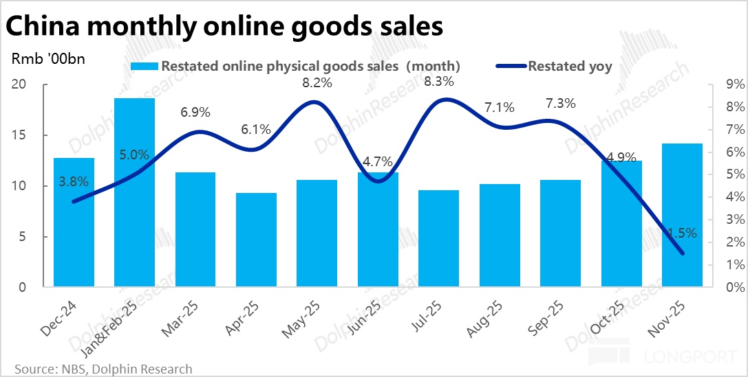 首先,不同於去年 10 月線上零售增速先較 9 月顯著提速,到 11 月再大幅滑落,呈一個很明顯的 “倒 S 型”。雖然今年 10 月增速確實也比 11 月明顯高,但較 9 月也已有不小的下滑。換言之,實際 10~11 兩個月的線上實物銷售的增速都並不好。