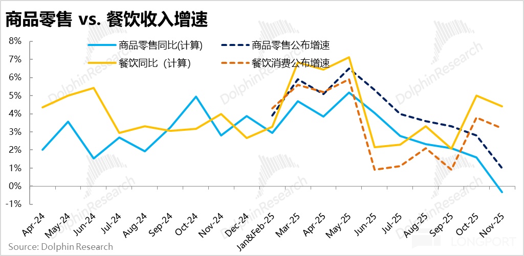 分消費類型看,按統計局披露的增速,11 月的商品零售和餐飲消費增速相比上季都有所走弱。但從絕對增速看,餐飲收入在 9 月外賣大戰最高峰過後,10~11 月的增速都穩定在 3% 以上,並不算很差。而商品零售的增速本月則跳水到僅 1%,是拖累整體社零的主要原因。後文我們再進一步從線上 vs.線下和分品類的增速,來看導致商品零售跳水的原因。