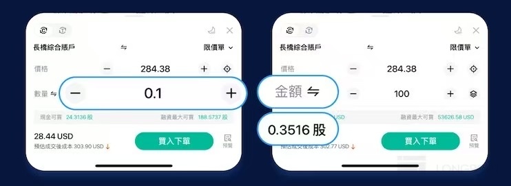 第二步,選數量:點擊【交易/買入】,在下單頁面,你可以選擇輸入「數量」(比如 0.5 股),也可以直接切換成輸入「金額」(比如 $50)。