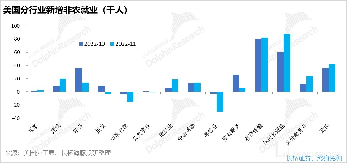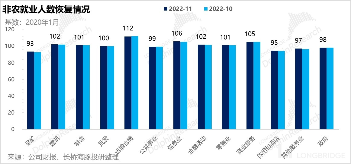 而到了 11 月,休閒和酒店也是各大行業當中唯一一個就業人數還沒有超過疫情前的行業,這裏的新增更多是彌補之前裁掉的工作崗位。
