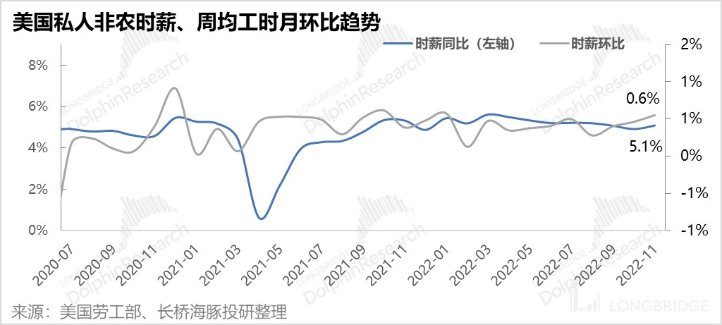 11 月美國私人非農時薪環比上漲了 0.6%,上個月是 0.5%,已經是連續兩個月上漲,這個數字非常重要,因為只有月環比漲幅先確定性停滯了,才有可能迎來同比薪資漲幅的企穩。由於環比的高增,同比薪資漲幅仍有 5.1%,具體美聯儲 2% 的 CPI 通脹目標仍有不小差距
