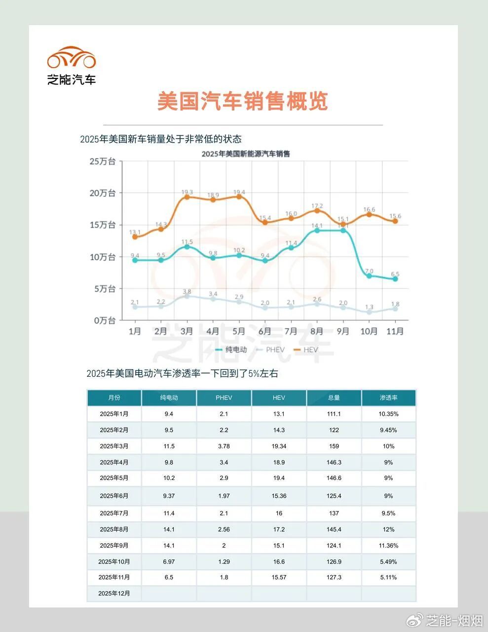 最直接的问题,还是市场没了。“One Big Beautiful Bill”等法案,2025年9月30日终止了高达7500美元的联邦新能源汽车购车税信用,美国市场上Q3销量提前爆发(7、8、9月销量分别为11.4、14.1和14.1万),Q4销量急剧下降(7.9万和6.5万),插电混动的销量也急剧下降。