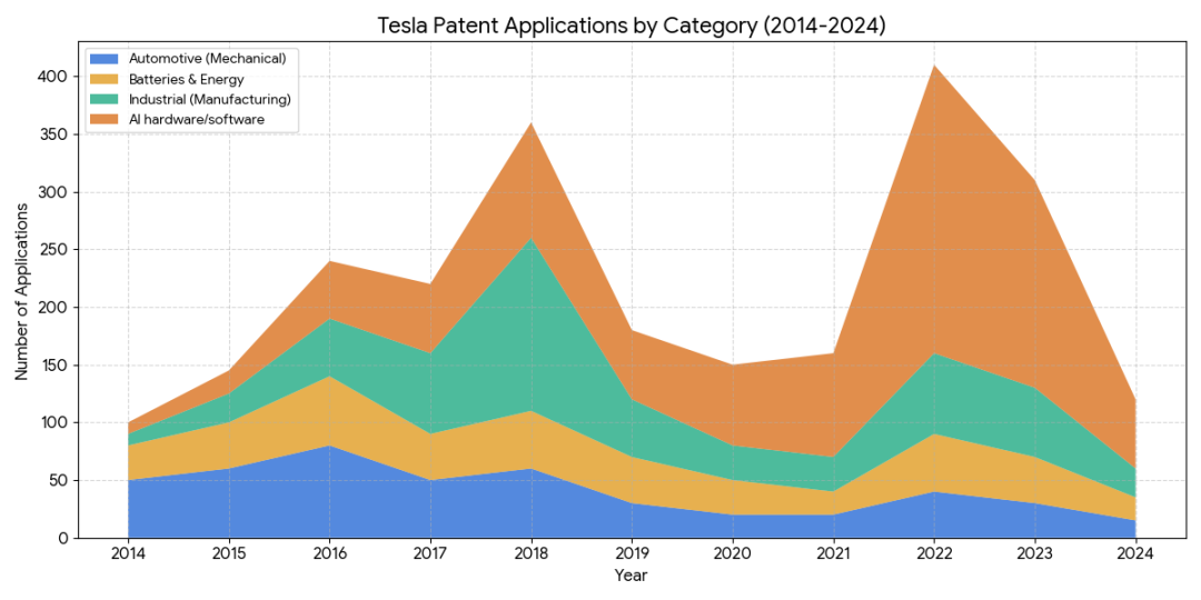 ◎ 第一个高峰出现在 2018 年,也就是著名的“Model 3 生产困难”时期,当时专利主要集中在制造和工业流程,把车造出来、把产能拉上去。