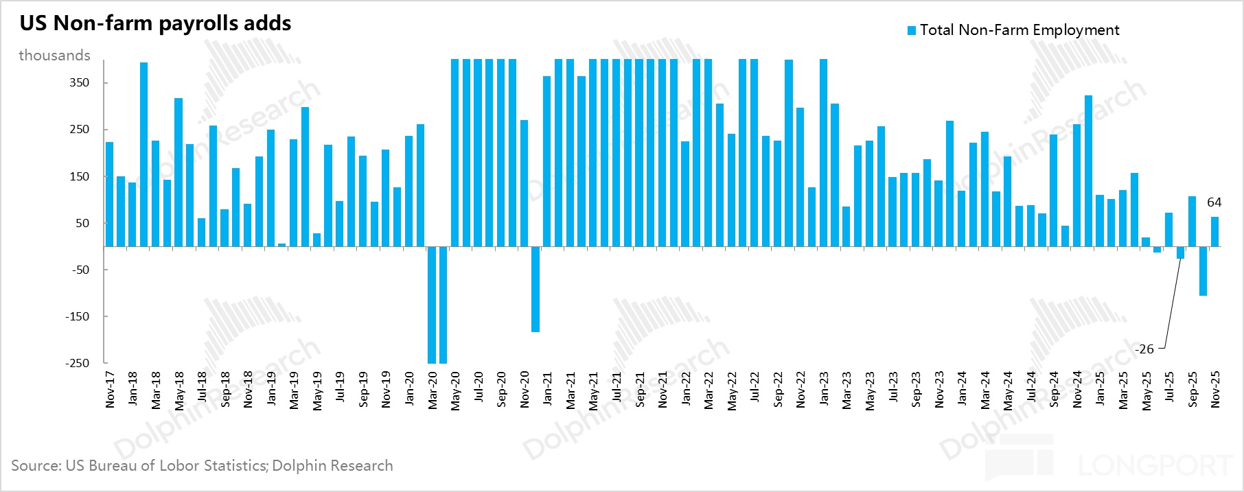 而這樣的通脹數據如果和就業放在一起,那降息的意味似乎就更明顯了:11 月新增就業 6.4 萬人,且 10 月新增就業還直接 10.5 萬人淨流失。