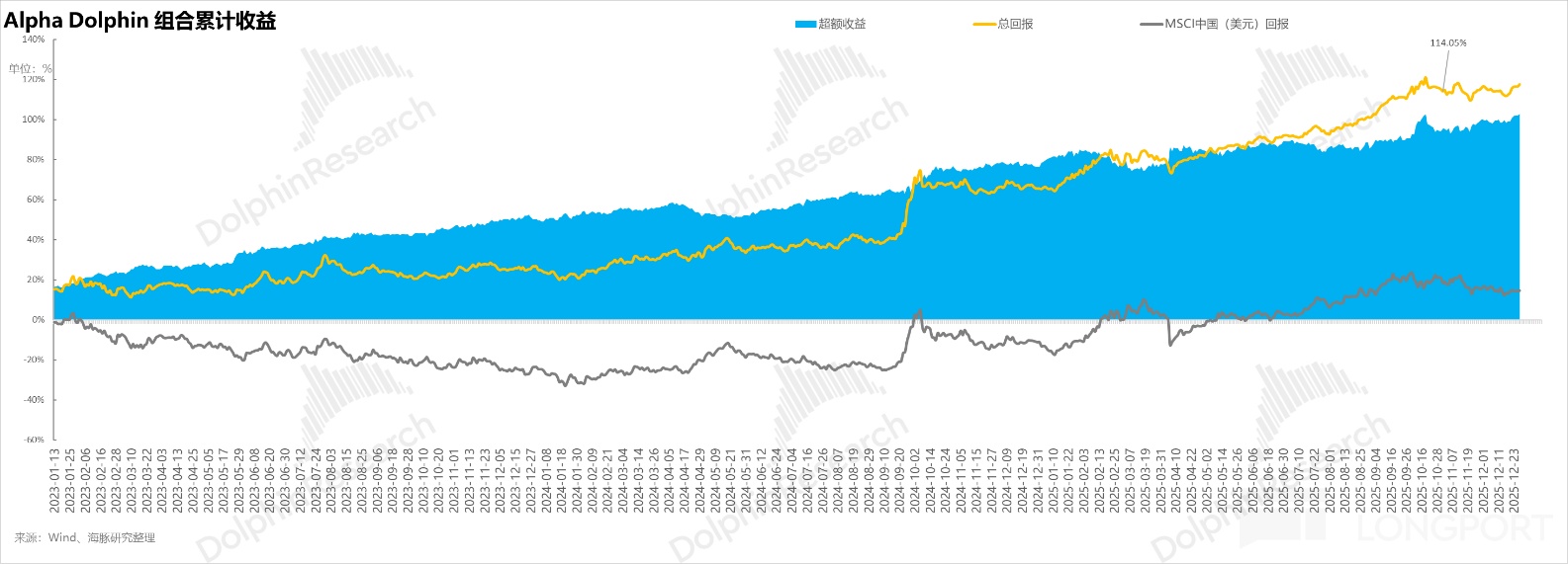 自組合開始測試(2022 年 3 月 25 日)到上週末,組合絕對收益是 117.5%,與 MSCI 中國相比的超額收益是 103%。從資產淨值角度來看,海豚君初始虛擬資產 1 億美金,截至上週末超過了 2.2 億美金,年尾基本牀下歷史新高。
