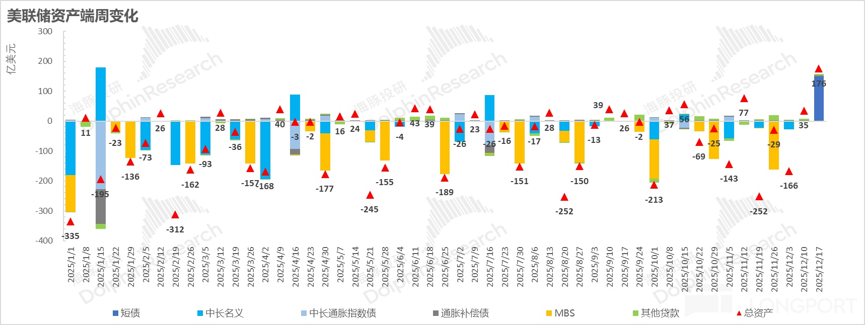 從 12 月中旬美聯儲的資產負債表能夠清晰看到,當下的美聯儲選擇了買短債(可以看成是一個小級別的量化寬鬆)來配合財政發短債。