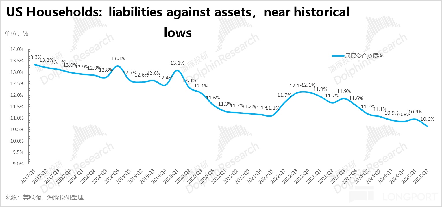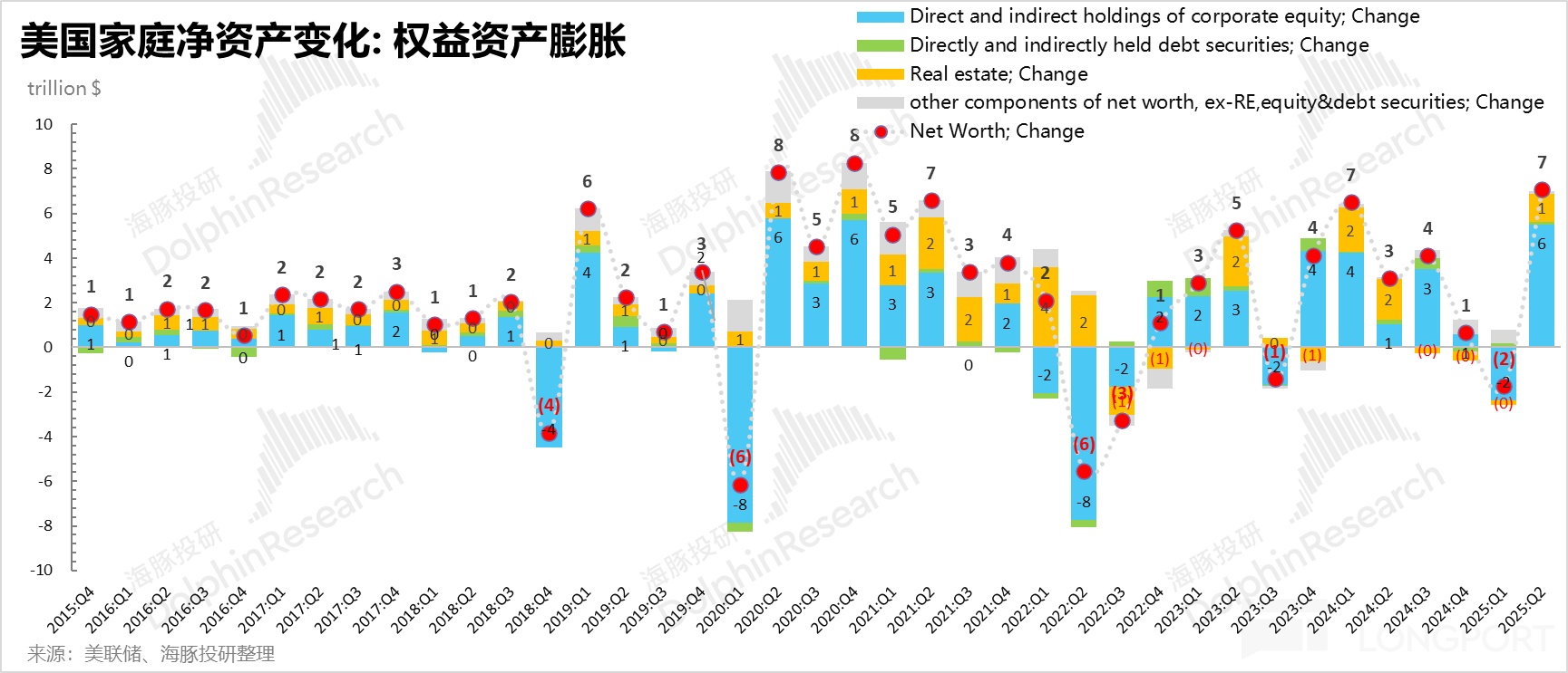 但這一輪核心是 AI 革命,似乎短期在就業上沒有利好,甚至是利空來體現的,但美股的持續走牛,讓美國有資產的人羣(美國家庭資產配置中,股票直接和間接持股在 40% 上下)通過資產升值,存量財富明顯膨脹,從而助長了消費力。