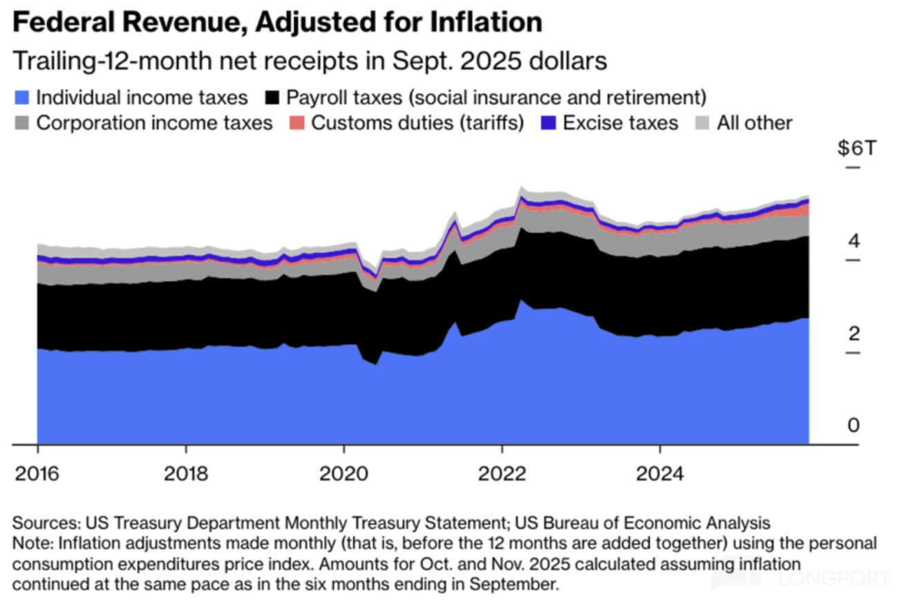 從美國財政盈餘增加值的貢獻來源上,美國居民資產收益高於薪資增長:美國財政徵收的個人所得税相比疫情前的增長率高達 26%,但同期薪資税增幅 14%,也就是説個人所得税中的資本利得應該明顯高於薪資增速。