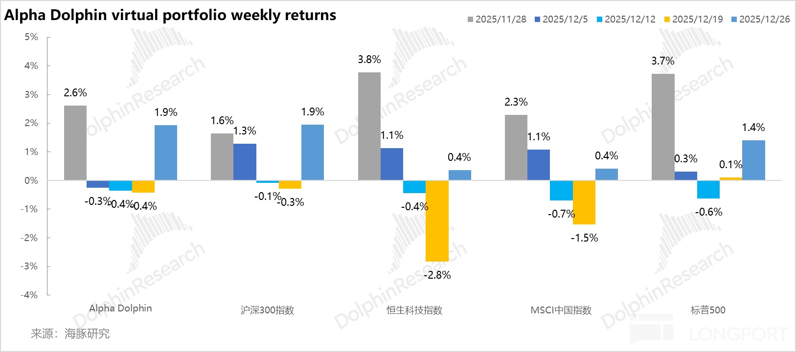 上週,海豚投研的虛擬組合 Alpha Dolphin 未調倉。當週上行 1.9%,跑平滬深 300(+1.9%),但跑贏了 MSCI 中國指數(+0.4%)與恒生科技指數(+0.4%),以及標普 500 指數(+1.4%)。最近幾周在股市的回調中,整體表現比較強的抗風險能力。