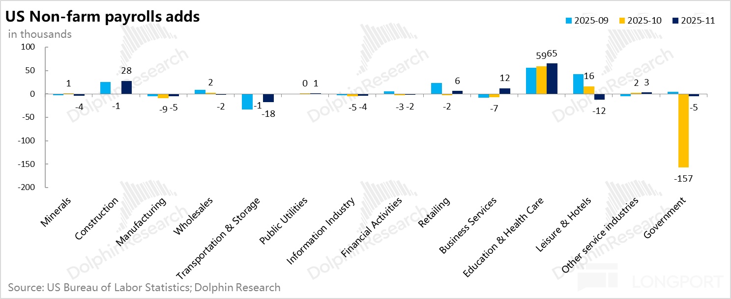 政府由於關門造成的就業波動是干擾項。重點看私人部分的就業情況:整個商品生產環節,除了建築業因 AI 投資就業持續較好,包括特朗普一直想要的製造業就業也是在持續回縮狀態。