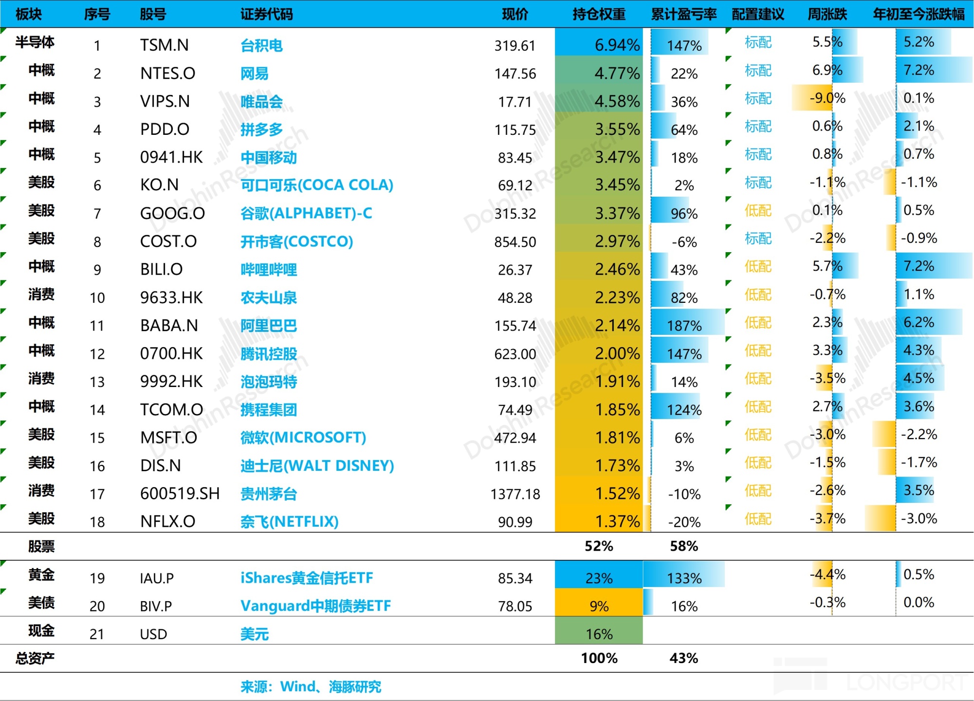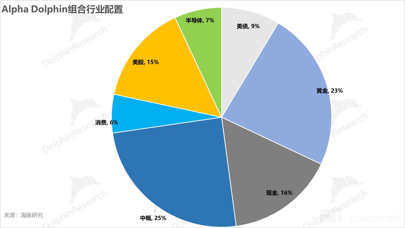 Alpha Dolphin 虛擬組合共計持倉 18 只個股與權益型 ETF,其中標配 7 只,其餘低配。股權之外資產主要分佈在了黃金、美債和美元現金上,目前權益資產與黃金/美債/現金等防守資產之間大約 52:48。