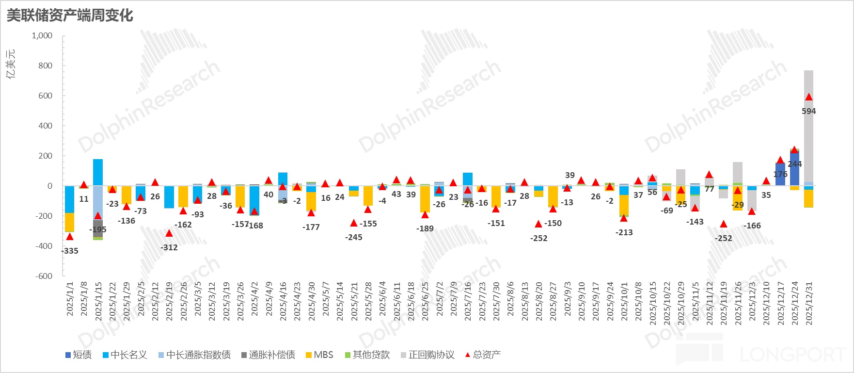 美國銀行體系流動性逐步緊張,美聯儲被迫釋放短期流動性:12 月中旬開始,有兩週時間直接用購買短債的方法來釋放短期流動性,到了 12 月底開始通過正回購工具來釋放短期流動性。
