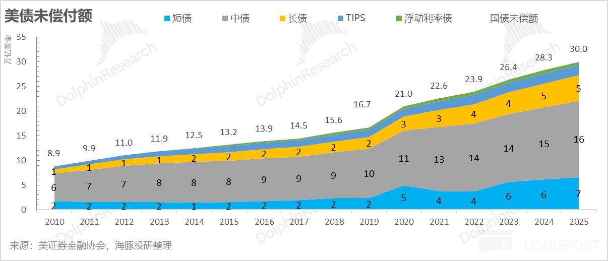 1)美債餘額從 2010 年開始,十年時間也就是 2019 年接近翻倍,幾乎達到 17 萬億。而從 19 年底開始到 2025 年的六年疫情週期中,直接從 17 萬億飆到 32 萬億,也是接近翻倍;