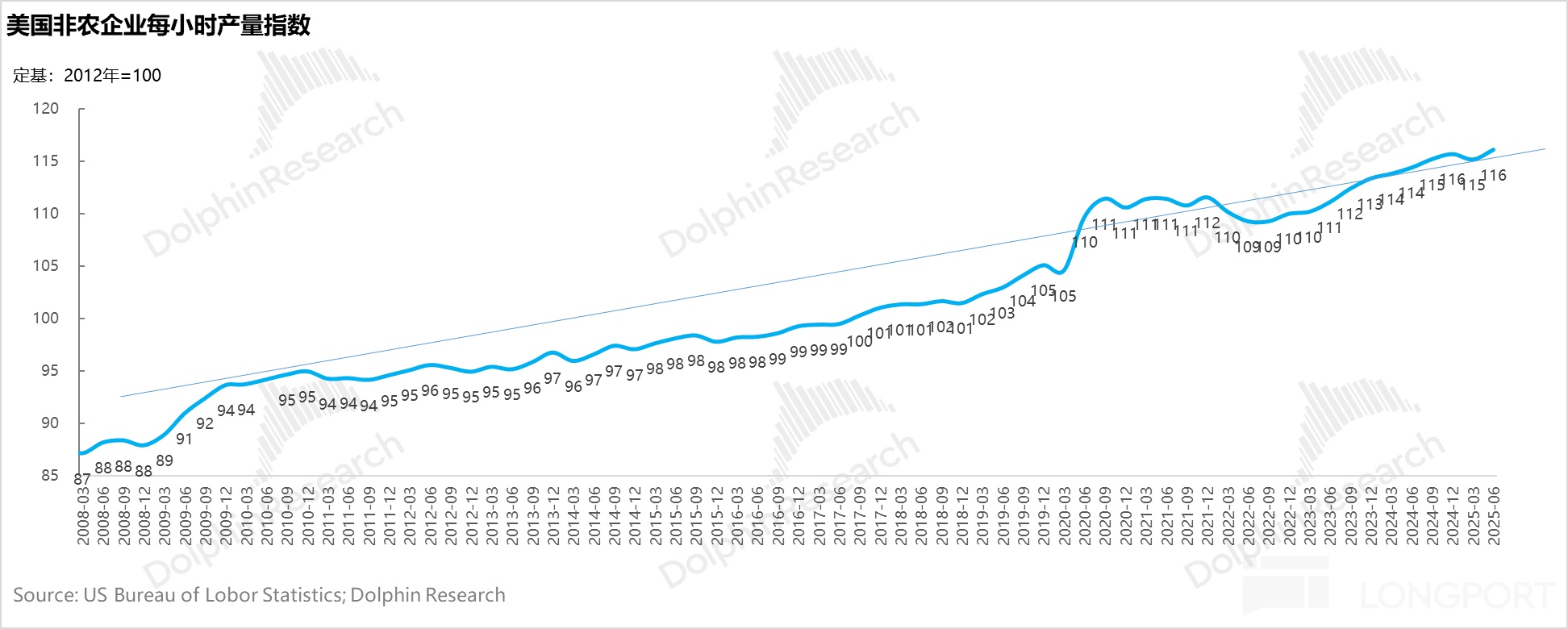 4)疫情和 AI 確實拉高了美國私營部門的生產力指數——非農企業每小時產量指數從疫情前的 105 拉高到了 2025 年年中的 116,拉昇斜率超歷史趨勢。