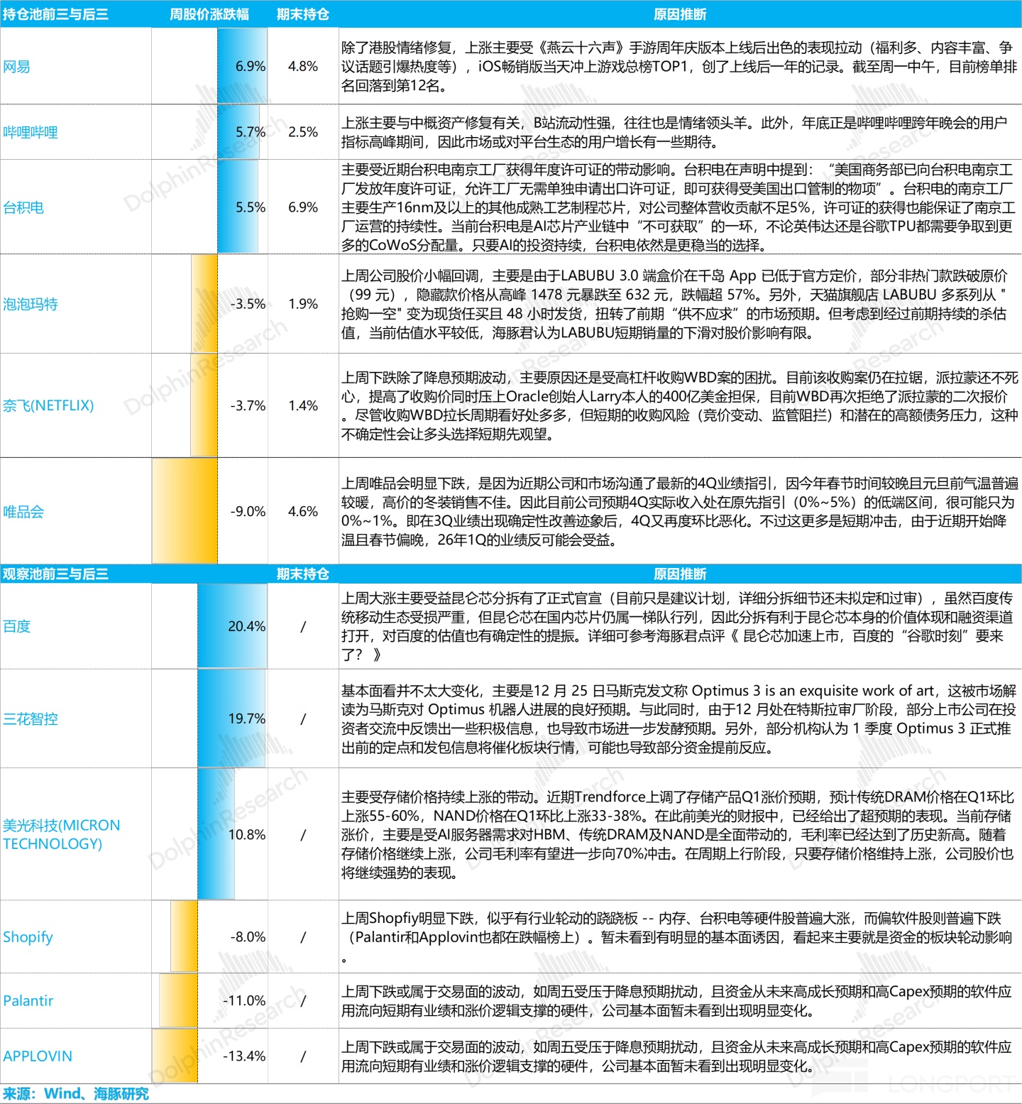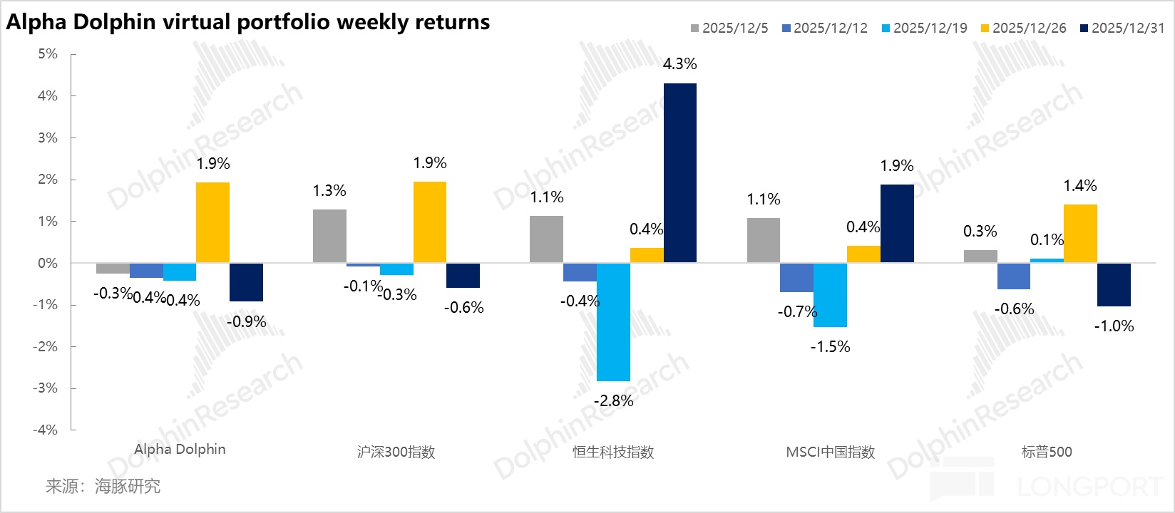 上週,海豚投研虛擬組合 Alpha Dolphin 未調倉。當週回落 0.92%,跑輸滬深 300(-0.6%)、MSCI 中國指數(+1.9%)與恒生科技指數(+4.3%),但跑贏了標普 500 指數(-1%)。主要因黃金回落,拖累持倉表現,此外部分重倉股因業績溝通也受到了影響。