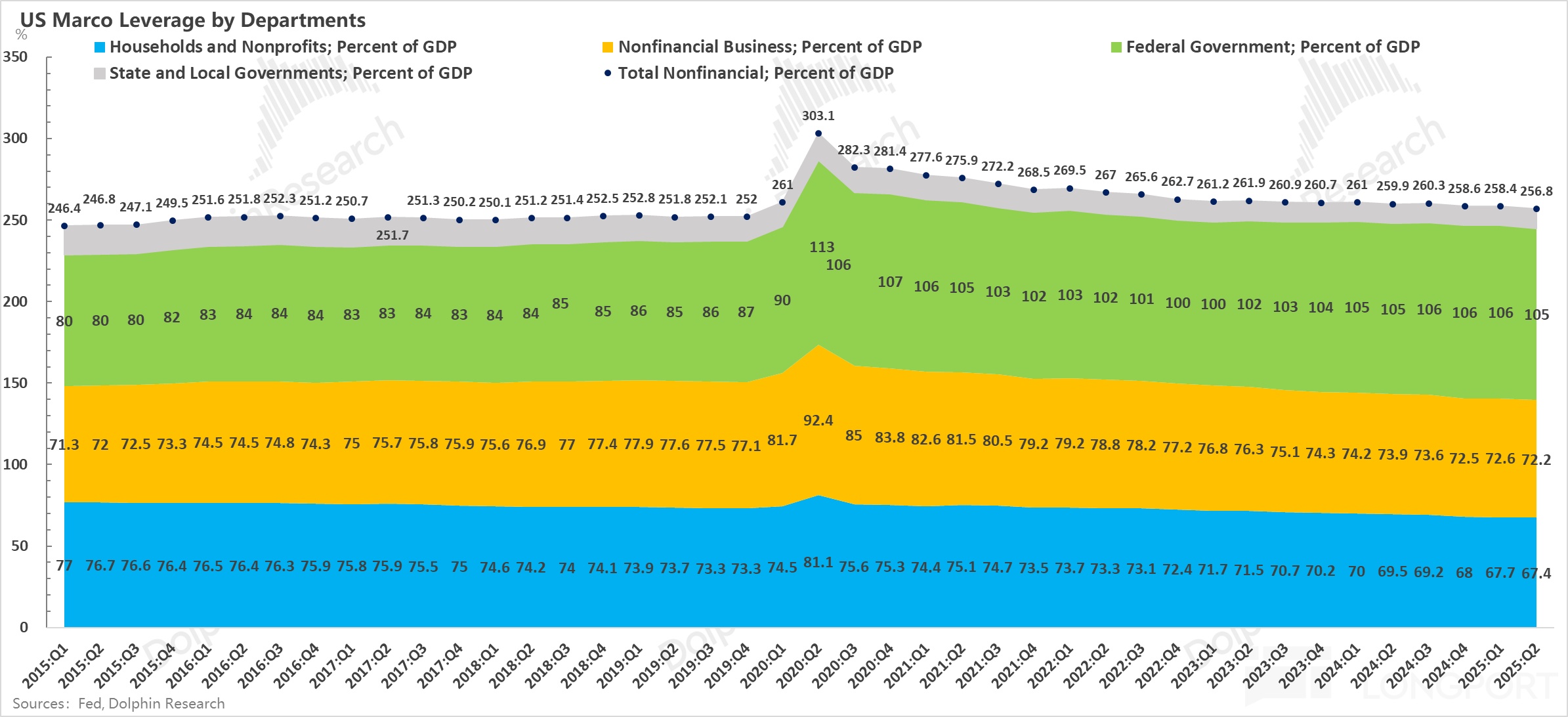 2)美國經濟整體的宏觀負債率疫情前常年穩定在 251%-252% 左右,到了 2025 年年中宏觀負債率 257%,結構性高於疫情前。