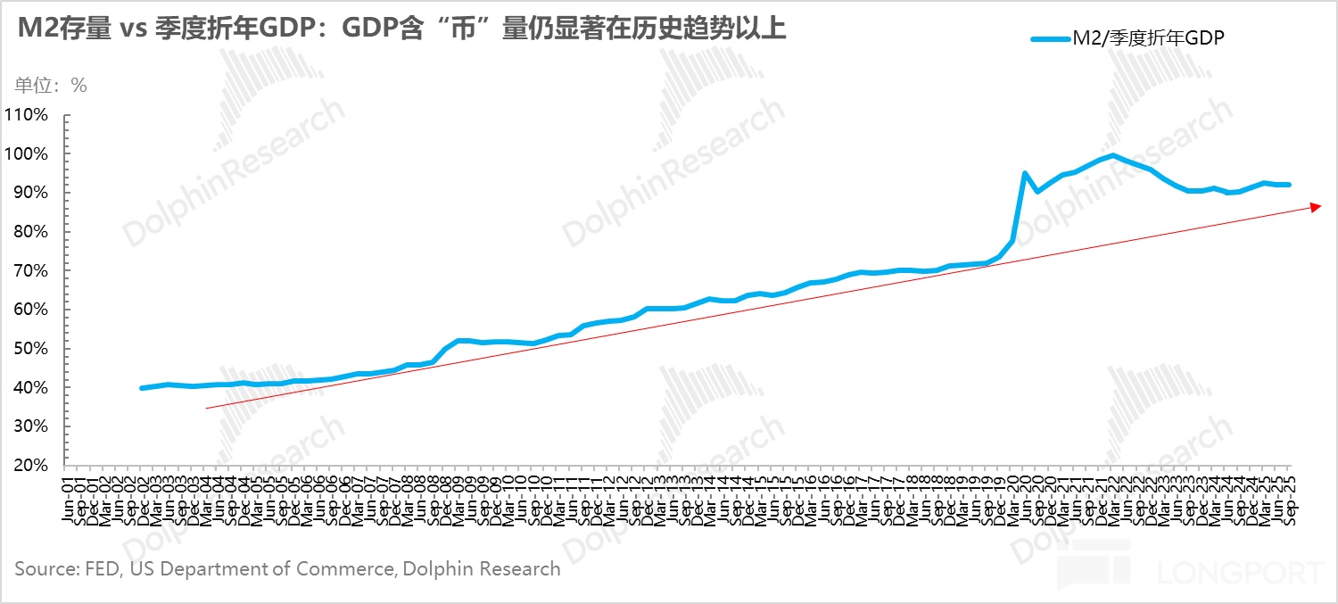 3)到 2025 年三季度,如果用美國貨幣供應 M2 對比美國 GDP,當下每一單位 GDP 的 M2“含幣量” 仍在歷史趨勢值之上。