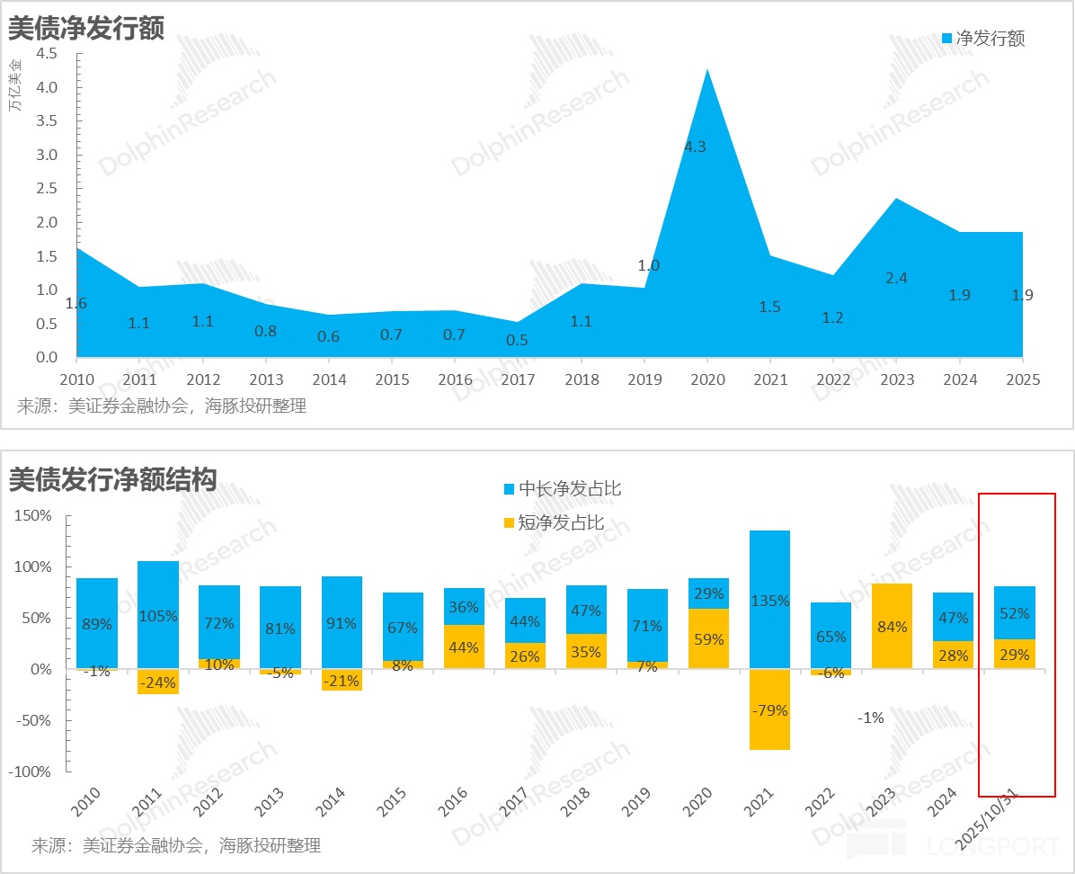 而此時再看債券市場上最大的需求方——美國財政部。25 年美國財政部合計在美債市場淨髮行 2 萬億美金上下,剛好對應 2025 自然年大約 1.6 萬億的財政赤字以及三千億美金上下的 TGA 補充額。