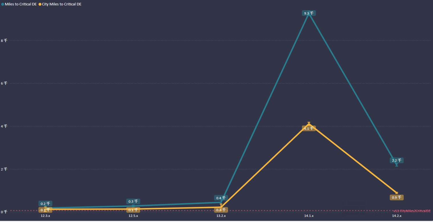 據 FSD Tracker 數據,V14.1 版本在城市複雜路況下的平均接管里程已突破 4000 英里,較 V13 的 200 英里實現指數級提升。
