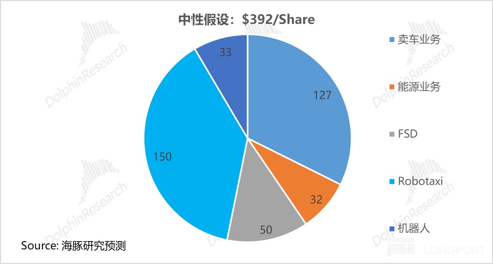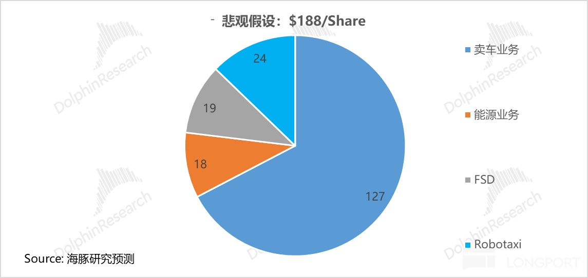 海豚君預計特斯拉目標市值為 6300 億(對應股價$188),特斯拉將退回由 “汽車 + 能源 “業務主導的估值。其中,特斯拉賣車 + 能源業務貢獻 4800 億美金(佔比 77%),而 AI 業務僅貢獻 1450 億美金(佔比僅 23%),在這種情形下,反而股價具備很高的安全墊,而 AI 業務變成了大幅折價的” 看漲期權 “。