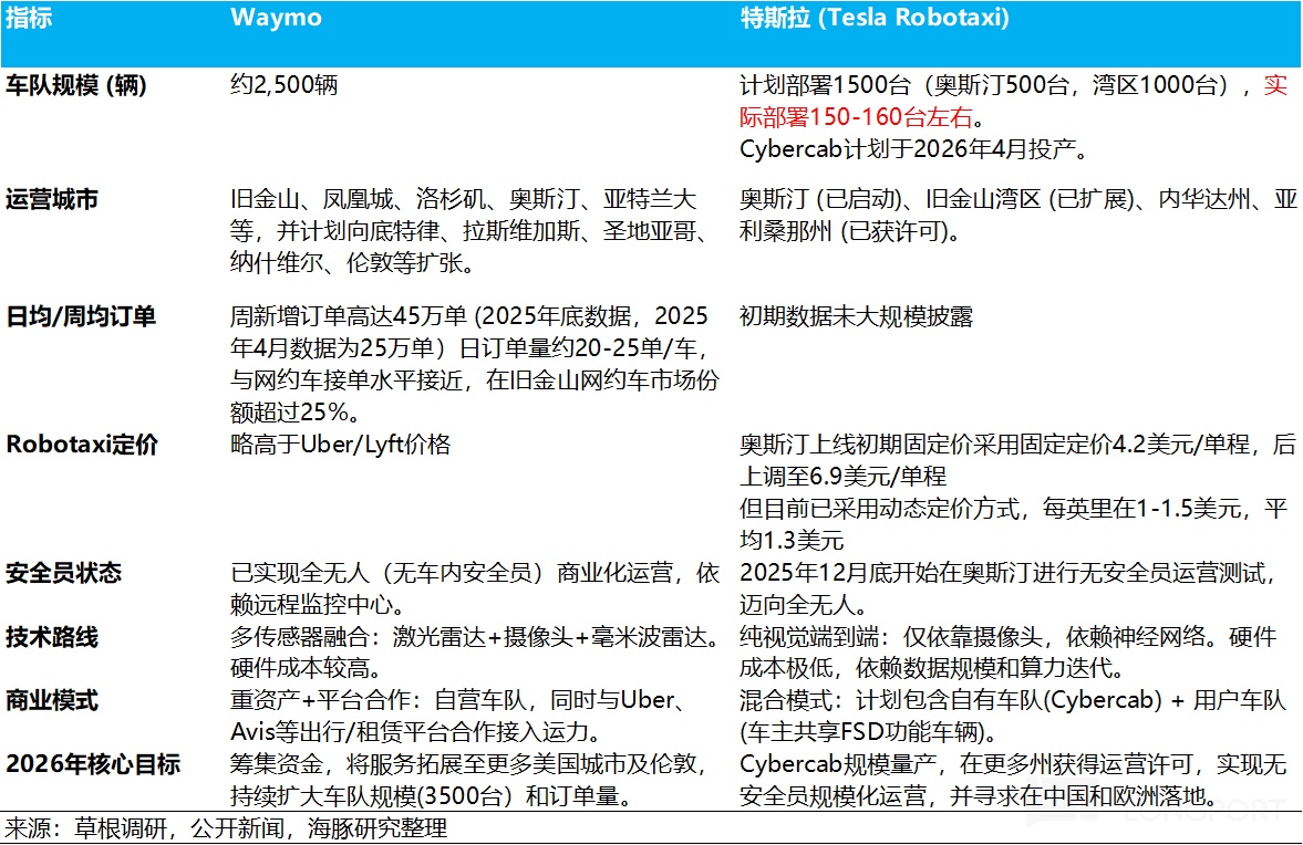 a.車隊規模與運營範圍(Waymo 暫時領先): 截至 2025 年底,Waymo 已在核心城市部署 2500 輛車。而 Tesla 雖在奧斯汀運營測試中移除安全員(但面向公眾的載人運營中仍配備),但受限於監管和技術磨合,實際 Robotaxi 部署僅約 150-160 輛。