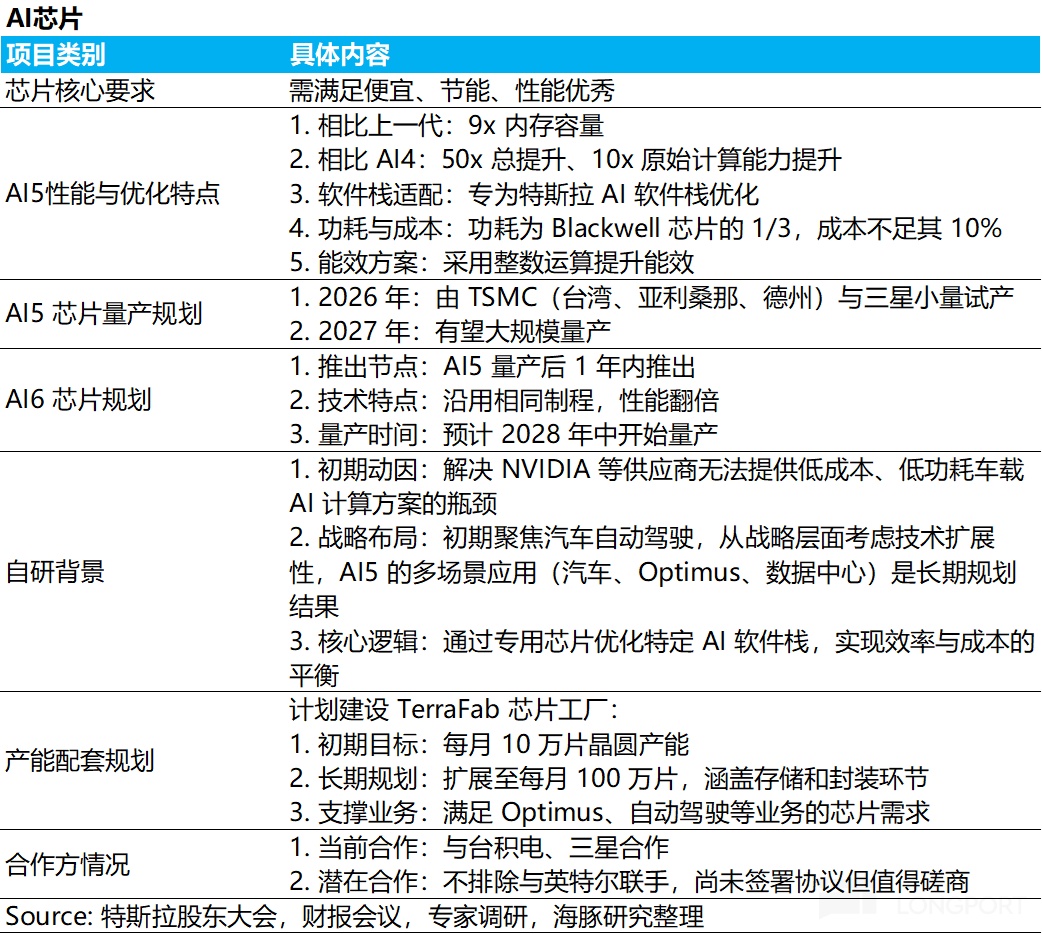 長遠來看,軟件進化倒逼硬件迭代:特斯拉計劃 2026 年底至 2027 年大規模量產總算力 2000-2500 TOPS 的 AI 5 芯片,算力儲備是當前 HW4.0 的 4-5 倍,為更大規模參數量模型部署提供基礎,推動 FSD 從 “輔助駕駛” 向 “無人駕駛” 演進。