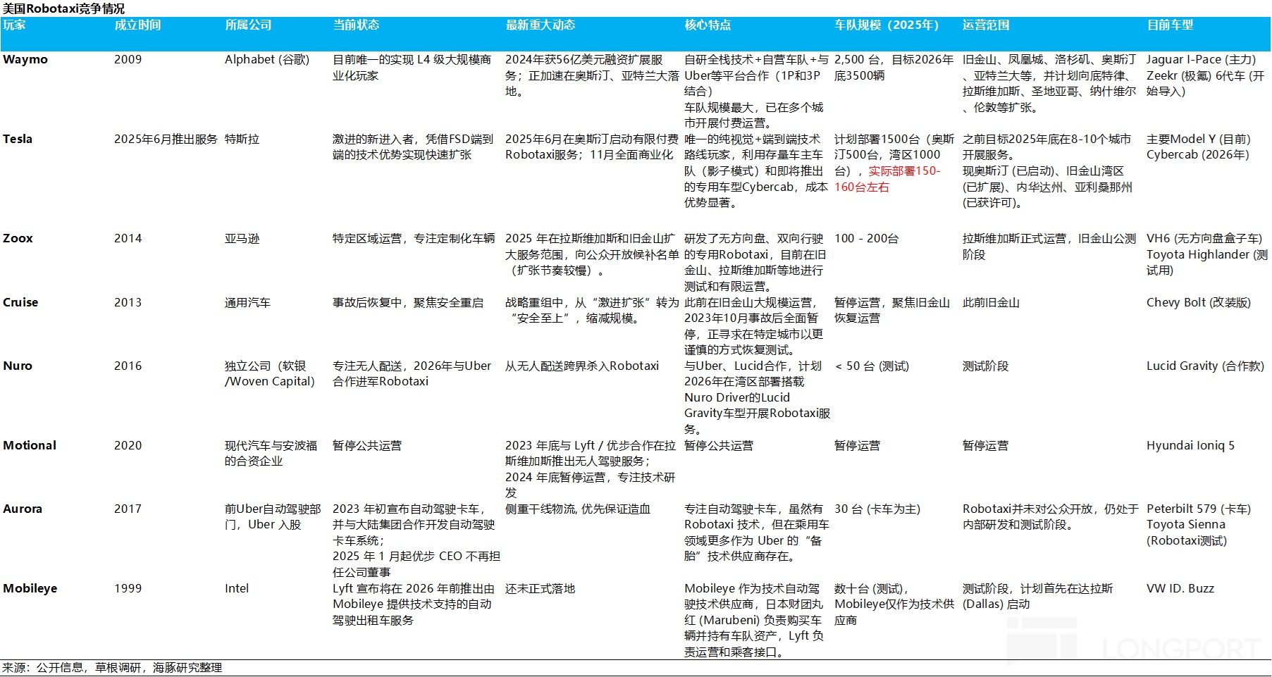 a. 行業元老 Waymo,憑藉先發優勢與成熟商業化佈局(2500+ 車隊數量)暫時領跑;