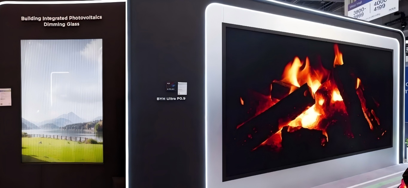 在公共與商用顯示方面,光伏調光幕牆採用領先的鈣鈦礦光伏技術,具有 “弱光發電” 的獨特優勢;BYH ULTRA P0.9 MicroLED 顯示屏在呈現精細畫質的同時,顯示亮度為 600 尼特時,功耗低至 180W/m²,兼顧視覺健康與節能需求。38.2 英寸反射式咖啡點餐顯示屏無需背光源,實現超低功耗,強光環境下也能清晰顯示;13.3 英寸彩色電子紙數字標牌以電子紙替代傳統紙質標牌,助力零售、辦公等場景實現無紙化轉型,遠程管理更智能便捷。