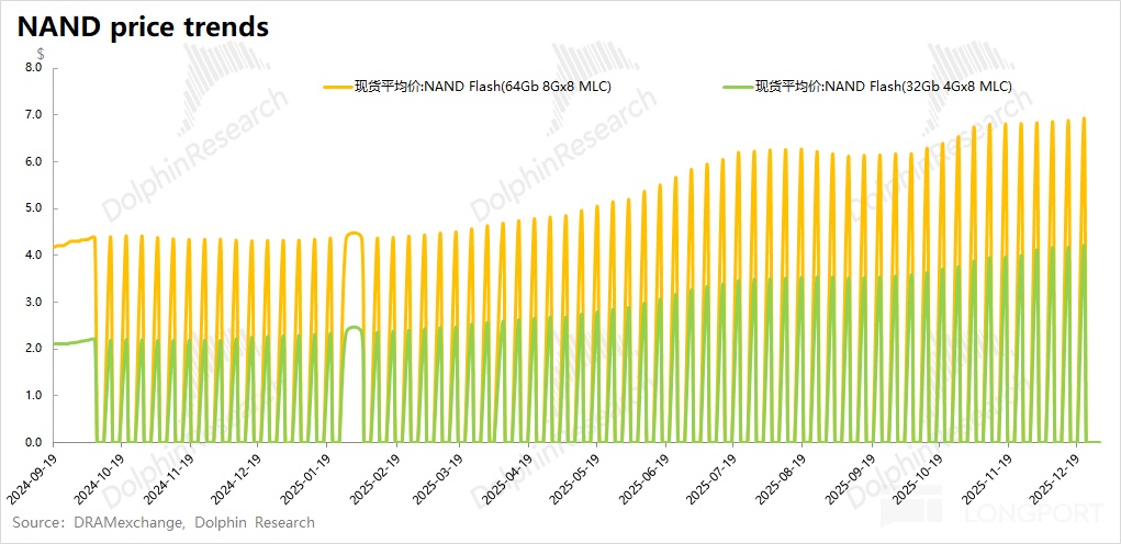 為了應對此前傳統半導體週期下行,三星、海力士等核心廠商開始減產,對 NAND 市場進行主動調整。供應端收縮的同時,需求端又受中國國補等政策刺激,這直接改變了原有的供需情況,NAND 價格也實現企穩回升;