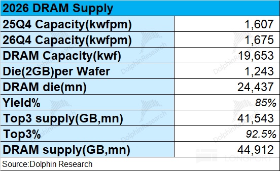 假定 DRAM 的整體良率在 85% 左右以及三家核心廠商的市佔率約為 92.5%,可以推測出 2026 年全球 DRAM 的整體供應量將近 449 億 GB 左右。