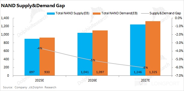 在當前市場預期 NAND 供應端保持 18% 左右複合增長的情況下,NAND 在 2026 年-2027 年的供需缺口仍將維持在 5-6% 左右。