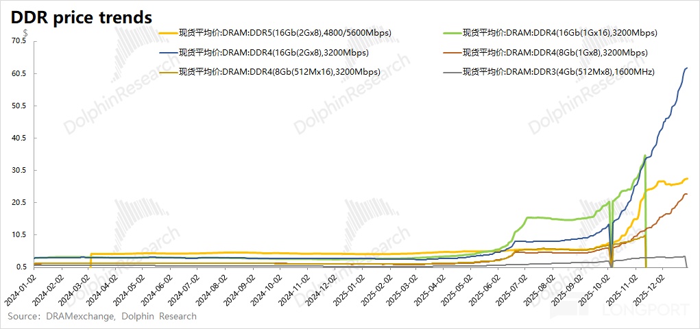 結合傳統 DRAM 的漲價情況來看,本輪 DDR 產品的價格大幅上漲主要也是從 2025 年下半年開始的。