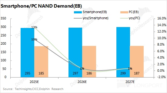 海豚君假定手機及 PC 領域的單機 NAND 需求量仍將保持增長,但終端產品的出貨量將有所下滑。可以估算在 2026 年和 2027 的兩年間,手機領域和 PC 領域對 NAND 的需求量分別在 298EB 和 187EB 左右,兩年增速同比僅有微幅增長。