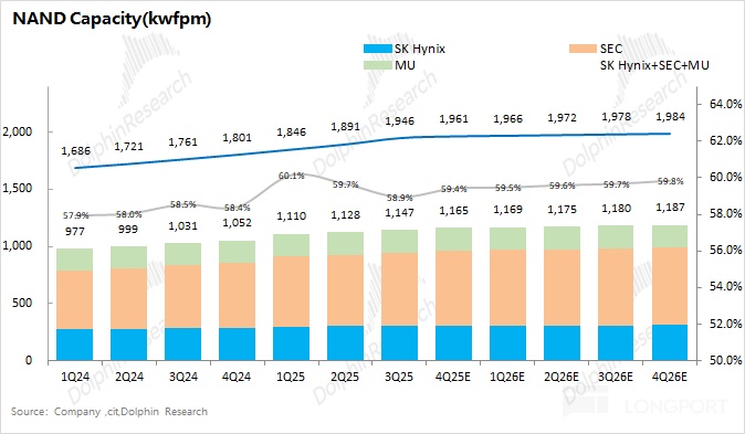 考慮到產能爬坡等情況,海豚君預估 2026 年的 NAND 市場整體產能在 2366 萬片左右,同比增長 4%。