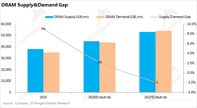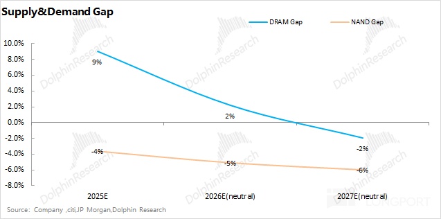在當前市場對供應端保持 18% 左右複合增長的預期之下,DRAM 的供需缺口在 2026 年還未明顯體現(供應充足度已經低於正常水位),而在 2027 年該缺口可能會擴大至 2% 左右。
