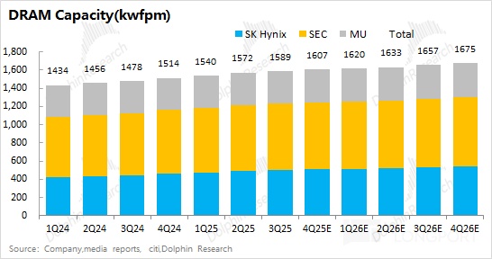 明年三家廠商繼續追加 DRAM 投入,合計月產能至 2026 年四季度有望繼續提升至 167.5 萬片左右。結合爬坡節奏來看,三家核心廠商在 2026 年的 DRAM 全年總產能有望達到 1965 萬片。