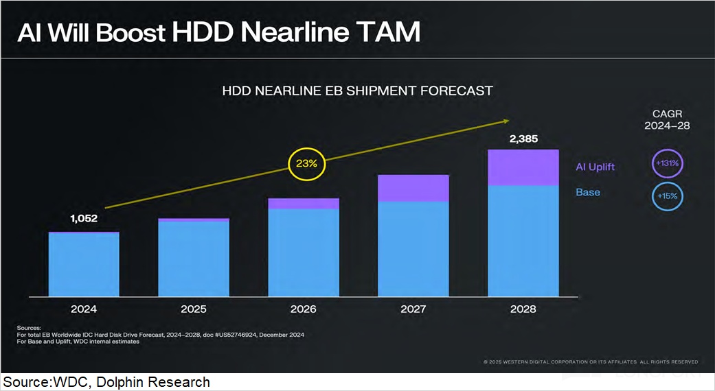 2)NL HDD 需求端:結合西部數據 WDC 預期,海豚君預估 NL HDD 的需求量增速在 2026 年和 2027 年分別為 33% 和 23%。